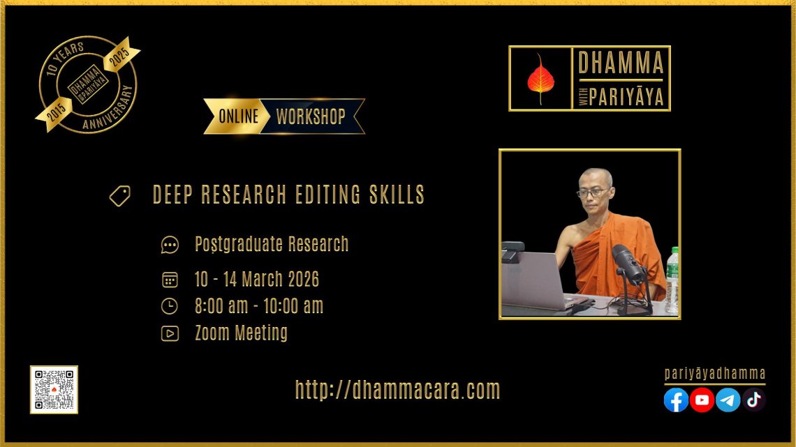 | Postgraduate Research | – Publication Manual – Quality Assurance | Dr Dhammācāra | 9 Mar – 7 Apr 2026 (Mon & Tue Only) 3:00 pm – 4:30 pm Zoom Meeting Meeting ID: Exclusive Access |